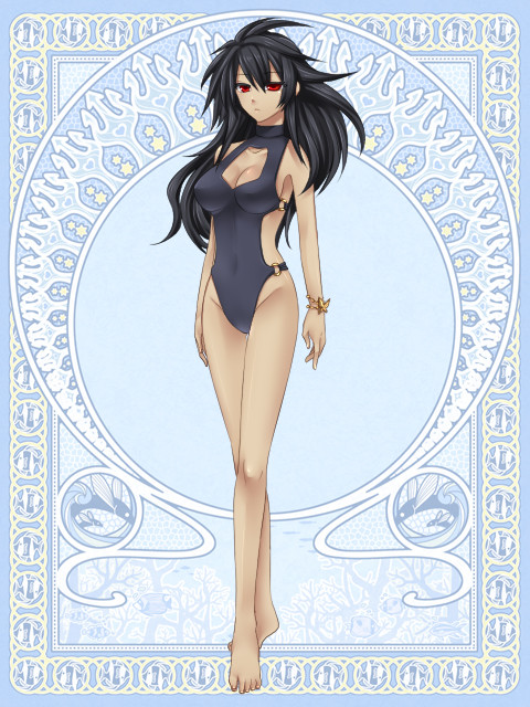 水着はモノキニで、色も指定…ポーズは静かな立ち姿で。